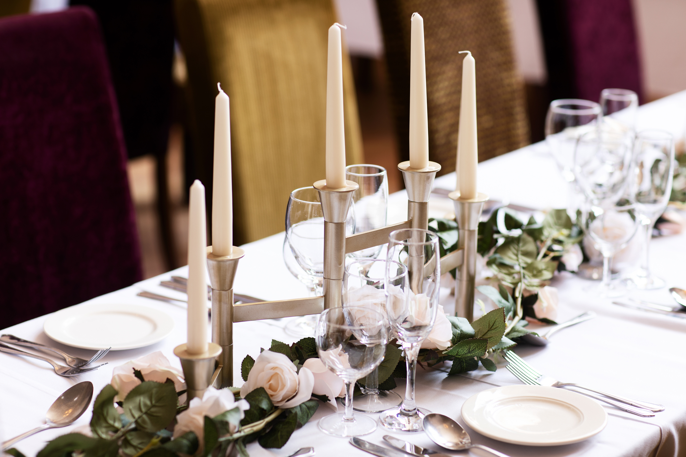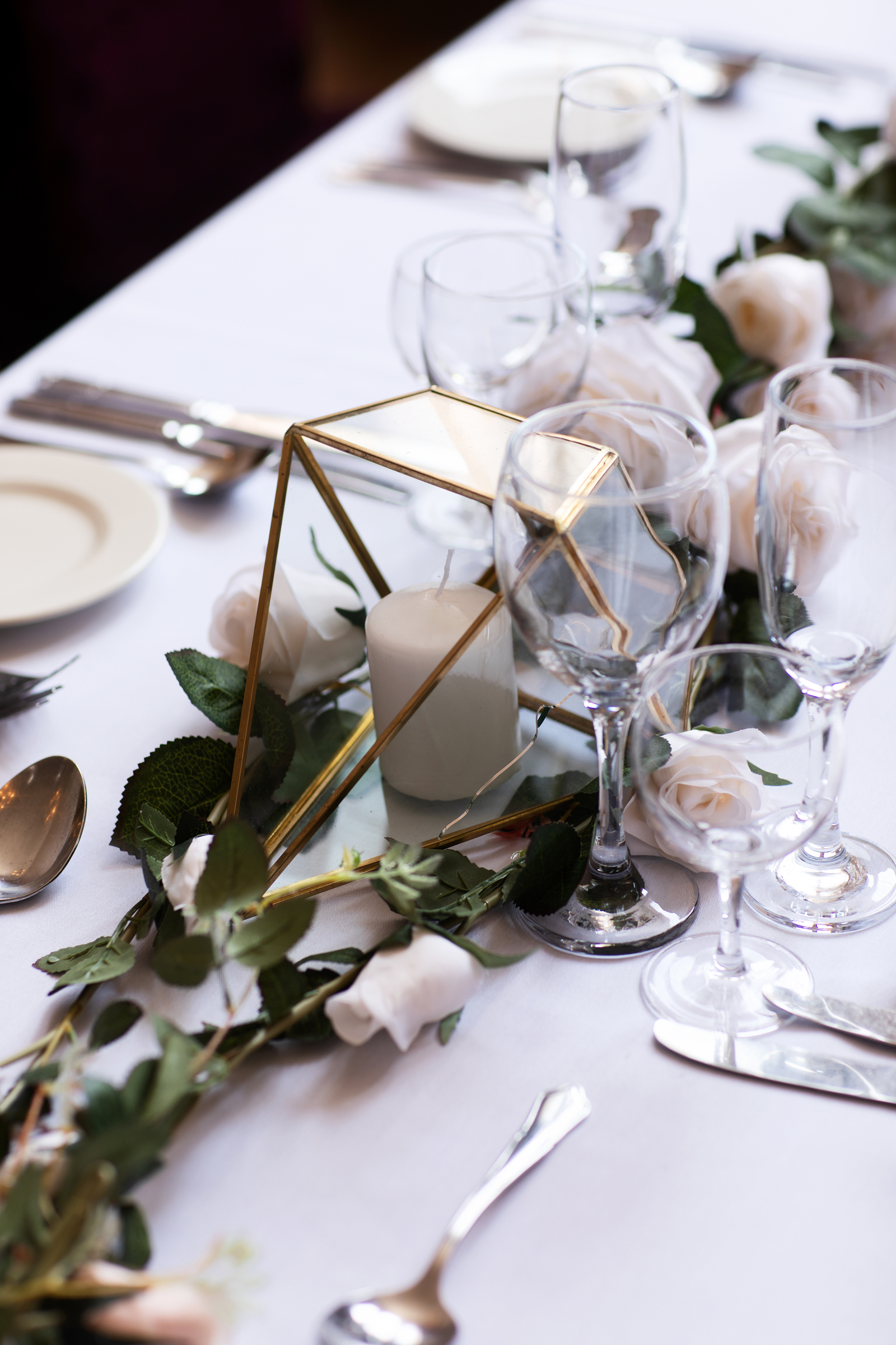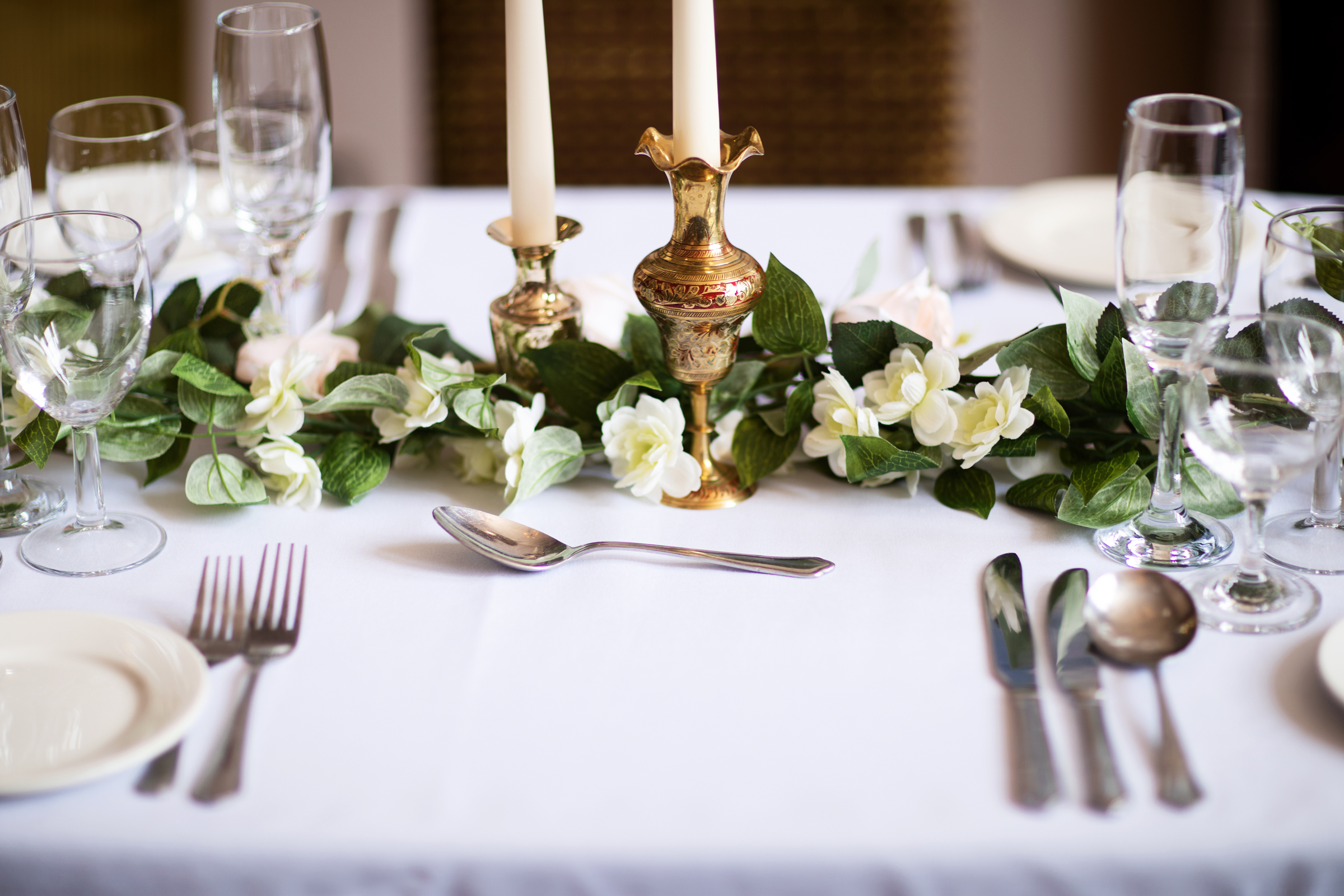 High-backed upholstered chairs Vintage brass candlestick centrepieces & rose garlands